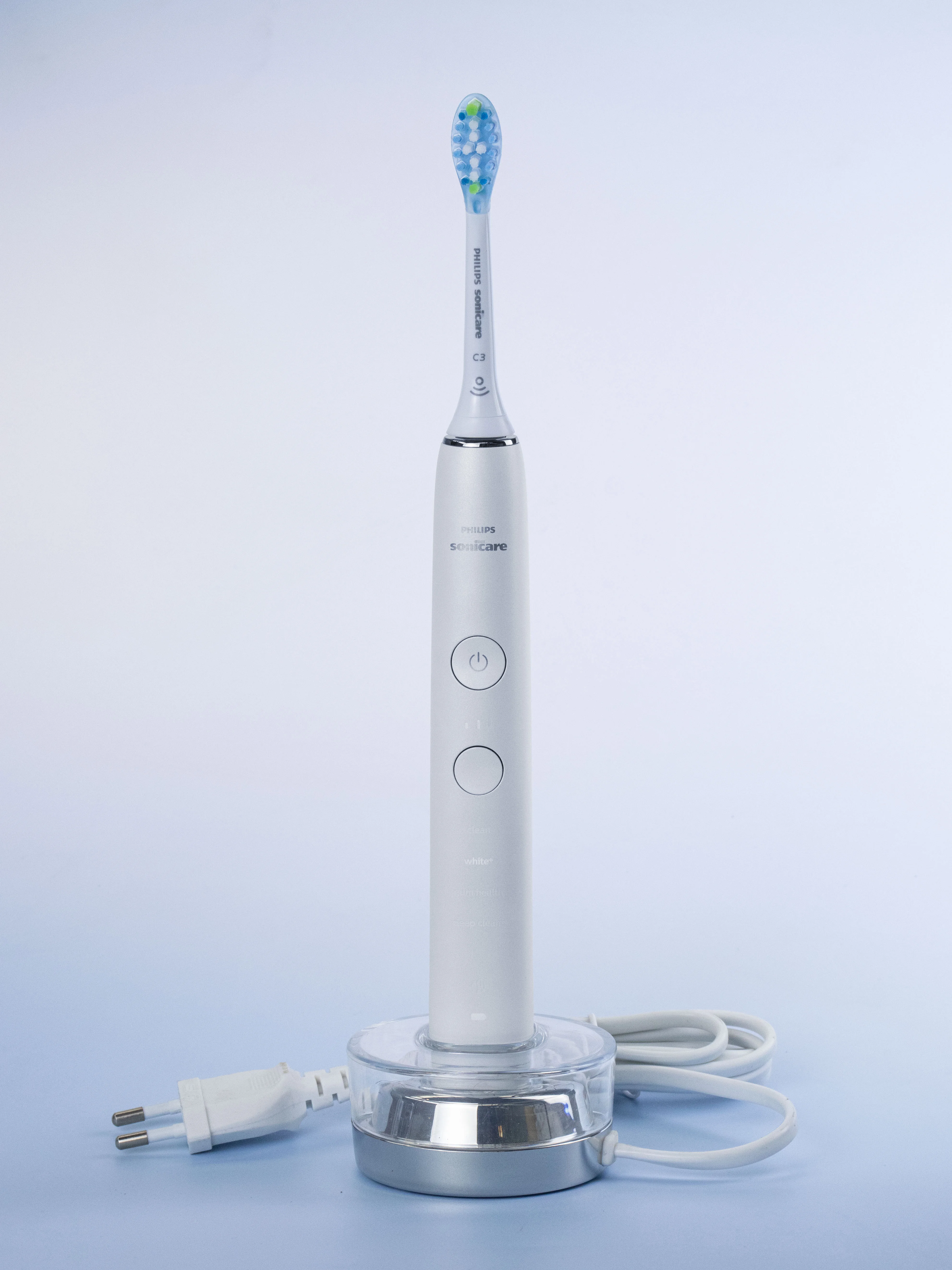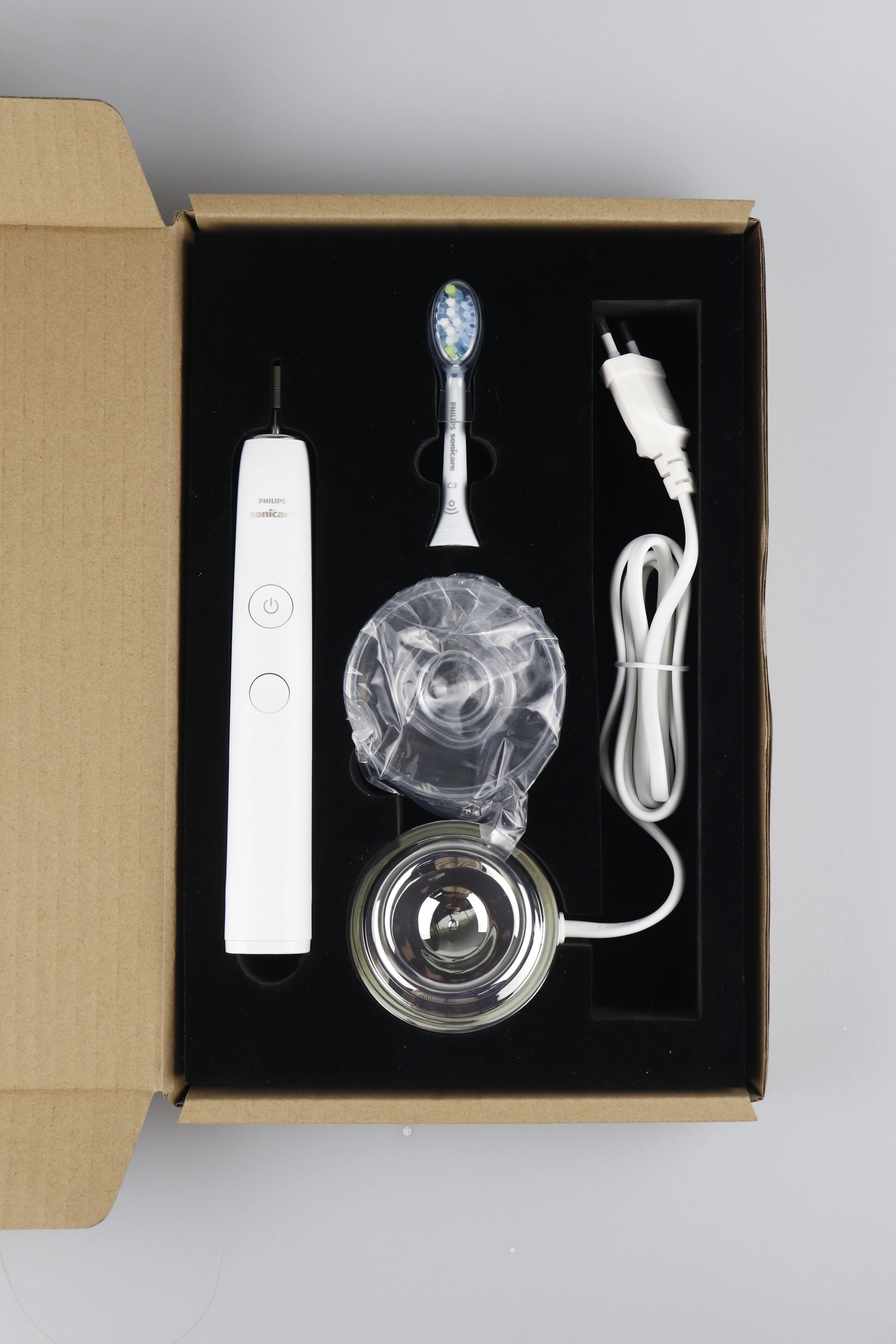 Original Electric toothbrush handle:With Bluetooth function, support connectionto Sonicare Fake Electric toothbrush handle:No Bluetooth function, unable to connect to the appOriginal brush head:It contains a chip, which can be automatically connected to thePhilips electric toothbrush to select the mode.NCF chip can jump to the official websiteFake brush head:Without a chip, Philips electric toothbrush selection mode cannot be connected.No NCF chipThe following are included in the set:-Charging base*1-Toothbrush head*-Toothbrush handle*1Please note: If you are in an area where the plugs are not European standard, please make a note. We will configure a charger adapter for you free of charge.Due to damage to the outer packaging of the product during long-distance transportation, we now provide electric toothbrush handles at discounted prices.Electric toothbrushes, brush heads and chargers are all original brand new and sold after repackaging.Get whiter, healthier teeth!Whiter teeth in just one day*!-Built-in pressure sensor-Intelligent brush head and brushing mode matching-4 modes, 3 levels of brushing force-Smart connection for easy cleaningRemoves up to 10x more plaque* for a deep cleanKnow you're getting the deepest possible clean with The C3 Premium Plaque Control brush head. The soft, flexible bristles are designed to curve around the contours of your teeth, giving you 4x more surface contact** and up to 10x more plaque removal from hard-to-reach spots.BrushSync automatically selects the best mode for youSmart brush heads ensure you're using the right mode and intensity for the best possible clean. For an example, say you're using the W3 Premium White brush head. Your DiamondClean 9000's BrushSync technology will automatically sync your brush head with the White+ mode to help whiten your teeth.Start and keep up healthy habitsThe DiamondClean 9000 gives you the guidance you need to improve and maintain healthy brushing habits in between dentist checkups. Built-in smart sensors let you know when you're using too much pressure, and by connecting your brushing experience to the Sonicare app, a personalized Progress Report helps you stay on track, to see how much you've improved over time.Personalized brushing experienceDiamondClean 9000 comes with Clean, White+, Gum Health and Deep Clean+ to take care of your brushing needs. Clean mode is for exceptional everyday cleaning, White+ is for removing stains, Gum Health provides a gentle yet effective clean for gums and Deep Clean+ gives you an invigorating deep clean. Three intensities allow you to choose between a higher setting to boost your clean and a lower one for more-sensitive mouths.BrushSync automatically selects the best mode for youSmart brush heads ensure you're using the right mode and intensity for the best possible clean. For an example, say you're using the W3 Premium White brush head. Your DiamondClean 9000's BrushSync technology will automatically sync your brush head with the White+ mode to help whiten your teeth.Lets you know if you're pressing too hardYou might not notice if you're brushing too hard, but your DiamondClean 9000 will. If you need to ease up, the toothbrush will make a pulsing sound. It's a heads up to let your brush head do the work. 7 out of 10 people found this feature helped them become a better brusher.Always know when to replace your brush headsAll brush heads wear out over time, so you'll want to keep an eye on yours to make sure you're still getting a great clean. Our BrushSync technology tracks how long you've been using your brush head for, and how hard you've been brushing. The BrushSync replacement reminder on your handle and a short beep gives you a heads up when it's time to replace it.Simple to charge and style to bootYour DiamondClean 9000 will last for up to two weeks on a single charge with regular use.